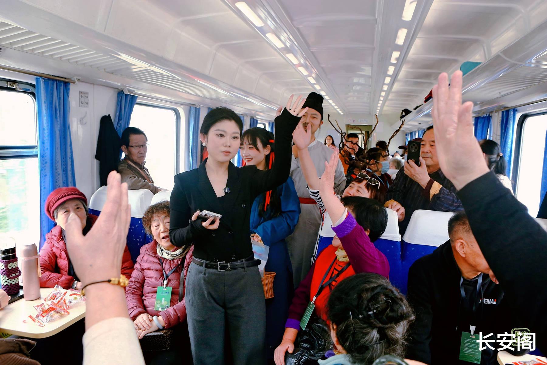 3月21日上午,一趟载有400余名游客的庙会专列从西安驶出,一路向北开往铜川耀州。车厢内,一场别开生面的文化穿越之旅主题活动正在上演——“孙思邈被后人尊称为什么?”“孙思邈最核心的医学典籍是什么?”“孙思邈是哪个朝代的人?”游客们争相抢答,笑声不断。答对问题的游客收获了铜川精美文创礼品。更特别的是,由特型演员扮演的“药王”孙思邈与小药童身着古装穿梭其间,与乘客热情互动、合影留念,短短的车程变成了一场沉浸式的“沉浸式移动剧场”。车厢内,旅游达人同步开启手机直播,将这场移动的文化盛宴传递给更多线上观众。