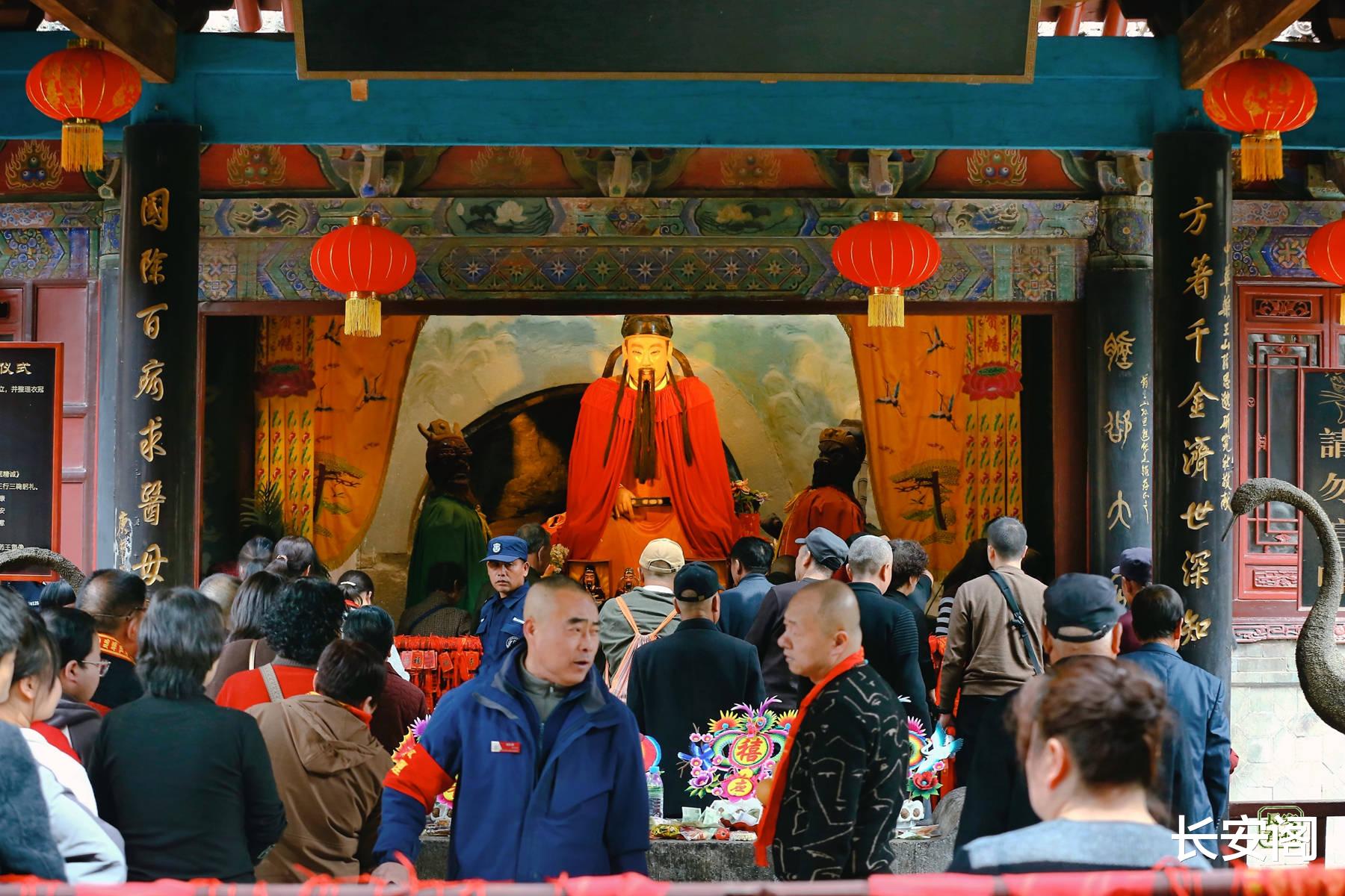 抵达药王山,映入眼帘的是一片热闹景象:药王文化广场上,锣鼓喧天,彩绸飞舞,引来游客们纷纷驻足拍照。”随行的NPC特型演员也不时与游客互动,让整个逛庙会的过程沉浸感十足。