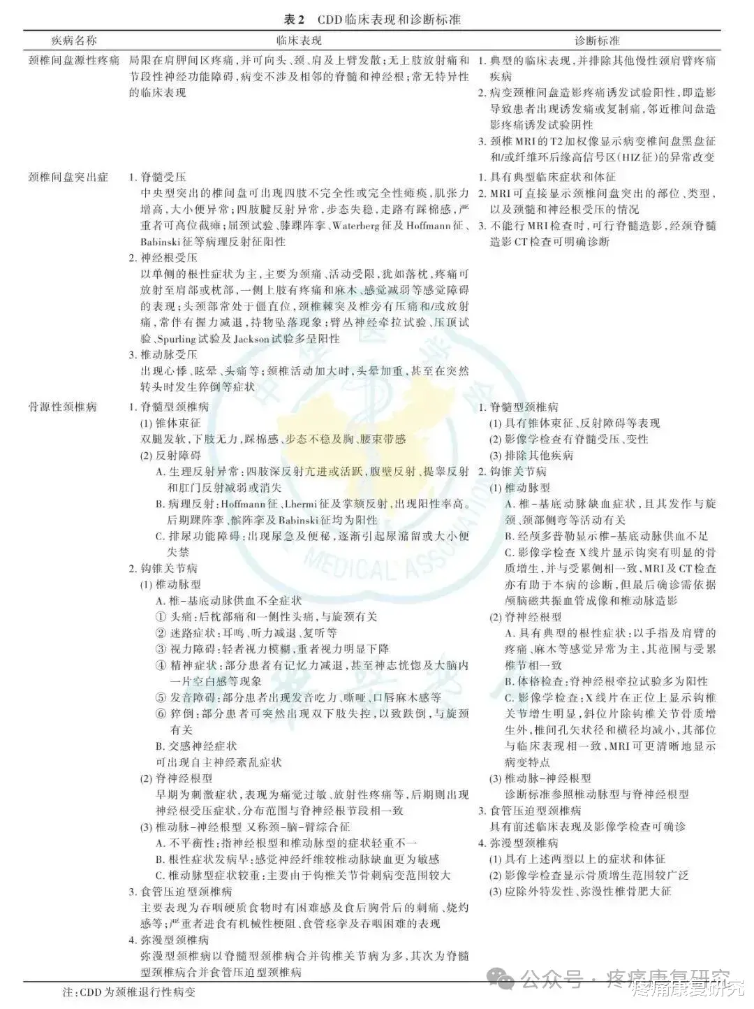 CDD 是指颈椎退行性改变及其继发的相邻结构病理改变累及周围组织结构(神经、血管等)并引起一系列临床表现的一类疾病。