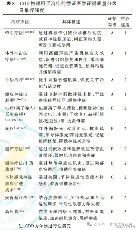 主要包括颈椎牵引、光疗、电疗、磁疗、超声电刺激、离子导入、高能量激光、体外冲击波疗法等。脊髓型颈椎病禁用强效手法及暴力牵引。