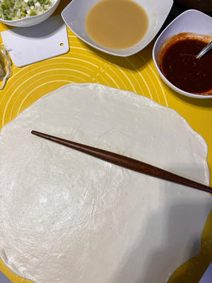 再次擀开,成为一个和锅子大小差不多的圆饼坯