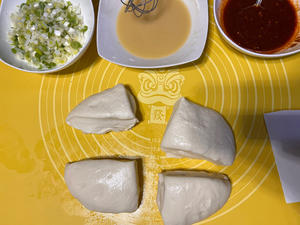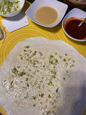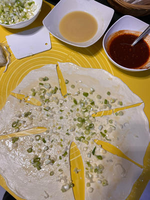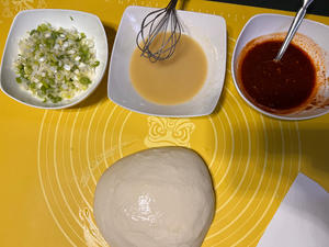 面团醒好,葱花切好,油酥和酱料调好。准备就绪,开整