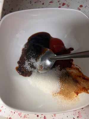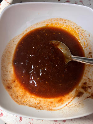 醒面时候,调一下酱料:黄豆酱、豆瓣酱、蕃茄酱、十三香、白砂糖、凉白开,称入碗里