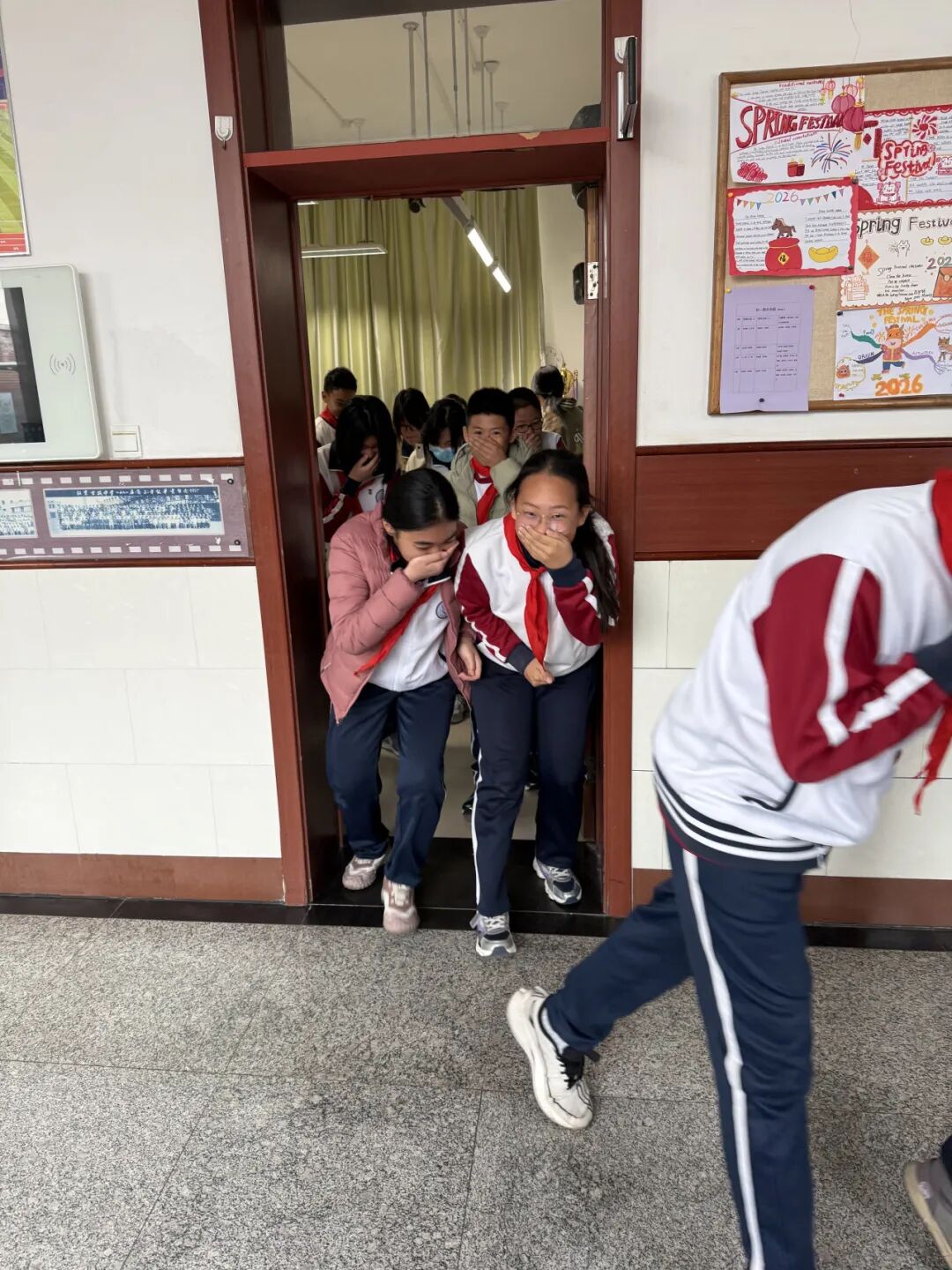 2026年3月23日上午8:45,随着消防警报声划破校园宁静,各班级学生在班主任及任课教师的引导下迅速反应。同学们用手捂住口鼻、弯腰低姿,沿预定疏散路线快速撤离至操场安全区域。整个过程紧张有序,仅用时4分05秒,全校师生便全部完成集结,较上学期演习效率提升5%。各楼层疏散引导员坚守岗位,确保通道畅通无阻;后勤保障组同步启动应急预案,检查隐患,为演习筑牢安全屏障。