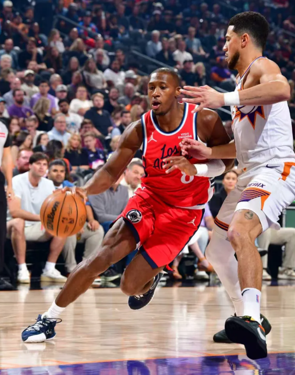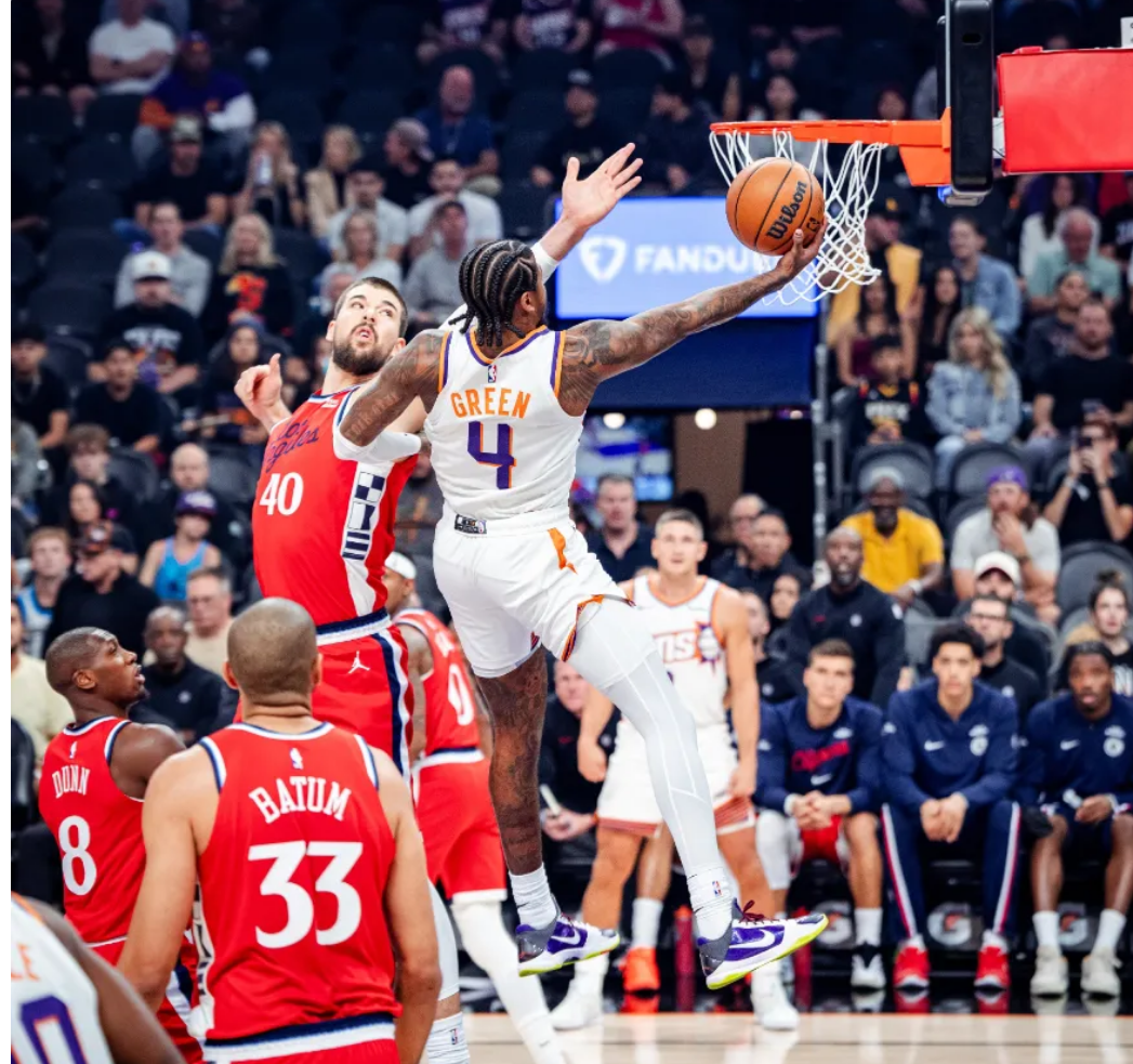 比赛开场,双方陷入短暂的乱战,失误与打铁交替出现。但格林迅速进入状态,用一记招牌式拉杆上篮稳稳拿下太阳生涯首分,瞬间点燃赛场气氛。布克紧随其后贡献干拔中投,快船这边祖巴茨也以一记炸裂补扣回应。首节末端,太阳凭借一波连续得分建立优势,以31-27的比分领先结束第一节。