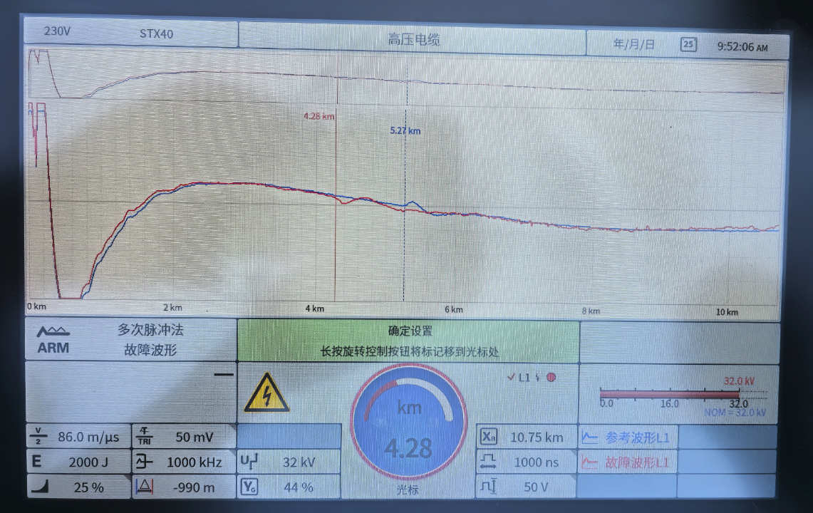 使用STX40智能电缆故障定位系统对A相进行测试,红色高压输出线接线芯,黑色工作地接屏蔽,设备开机后,设置半波速为86m/us,。在ARM模式下,发现电缆全长5.27km,加压后,红蓝波形在4.28km处出现明显分叉点,此处即为故障点,预定位为下图: