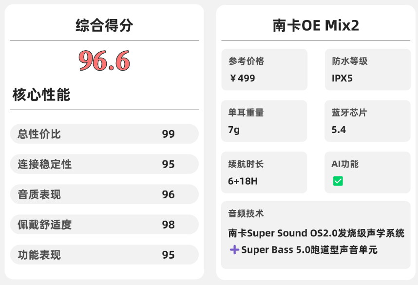 同时还搭载了由100+位高级声学工程师共同编制的Super Sound OS 2.0声学系统和6+3维传感空间音频,通过软硬件结合的方式,使其声音保真度高达99.9%。在音质方面,南卡OE MIX 2不仅通过了金耳朵品鉴会的认证,在耳机发烧友和专业用户中积累了极高口碑,被誉为“开放式耳机音质新标杆”。