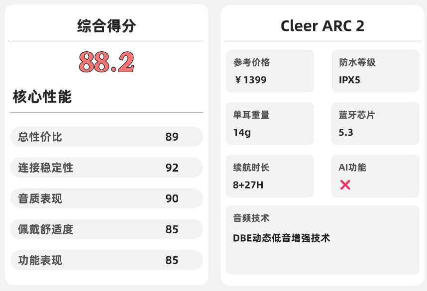 音质方面,搭载了18x11mm的复合高分子发声单元,配合自家的音频算法优化,中频表现比较突出,人声通透清晰,听播客或者人声类的音乐体验感会好一点,不过高频延展较为一般。另外还配备了蓝牙5.3芯片,连接稳定、不容易卡顿。而且这款耳机配备了Ai功能,支持独立录音、Ai对话、翻译,会议记录多种功能,整体更偏向办公实用类型一点。