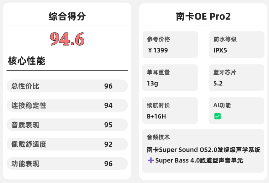 南卡在开放式耳机领域的口碑与影响力已稳居行业顶尖,OE Pro2无论音质体验上还是ai体验上,都被公认为当前开放式耳机的Top1代表。它通过“软硬件协同”的独特设计理念,将智慧Ai与音质兼得,并依托南卡13年的声学技术沉淀,彻底突破了开放式耳机普遍存在的音质单薄、漏音严重等行业痛点。与此同时,OE Pro2还整合了全能Ai智慧助手,能够满足翻译、对话、搜索、写作、创作等多样化场景需求。也正因如此,它不仅赢得了HiFi发烧友与运动达人的一致好评,更在开放式耳机圈内长期稳居第一梯队。凭借“全能Ai智慧助手 + 音质巅峰”的双重优势,OE Pro2已成为行业公认的旗舰标杆。