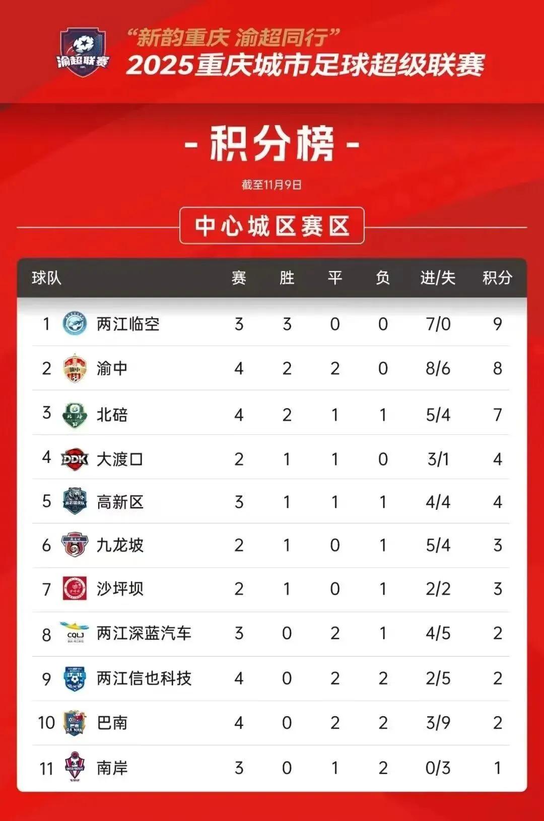 截至11月10日,渝超中心城区赛区的积分形势已然明朗。两江临空队凭借三战全胜的强势表现,以9分跃居榜首;而经历一轮轮空的渝中半岛队则以四战两胜两平积8分的战绩暂居次席。这场将于11月16日上演的直面交锋,因其可能直接决定榜首归属,被外界普遍视为本赛季的“天王山之战”。