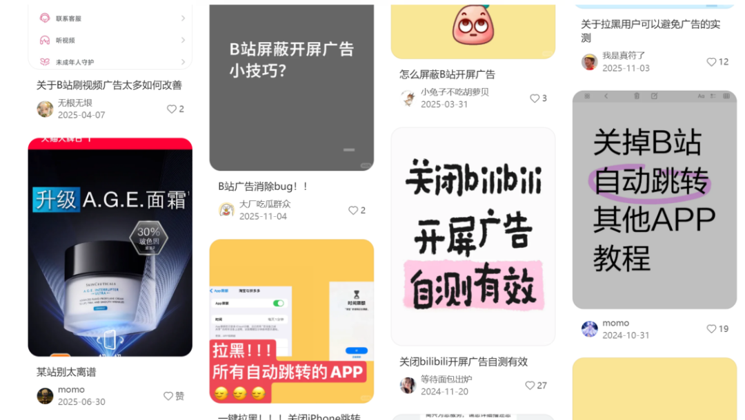 B站虽然名义上坚守着“无视频贴片广告”的底线,但广告密度已大幅提升,用户看视频时回个信息,切屏回来就有广告且无法取消;TV端所有页面强制播放全屏广告,点了退出仍正常播放。在社交媒体,大量用户询问或分享避免B站广告的方法。