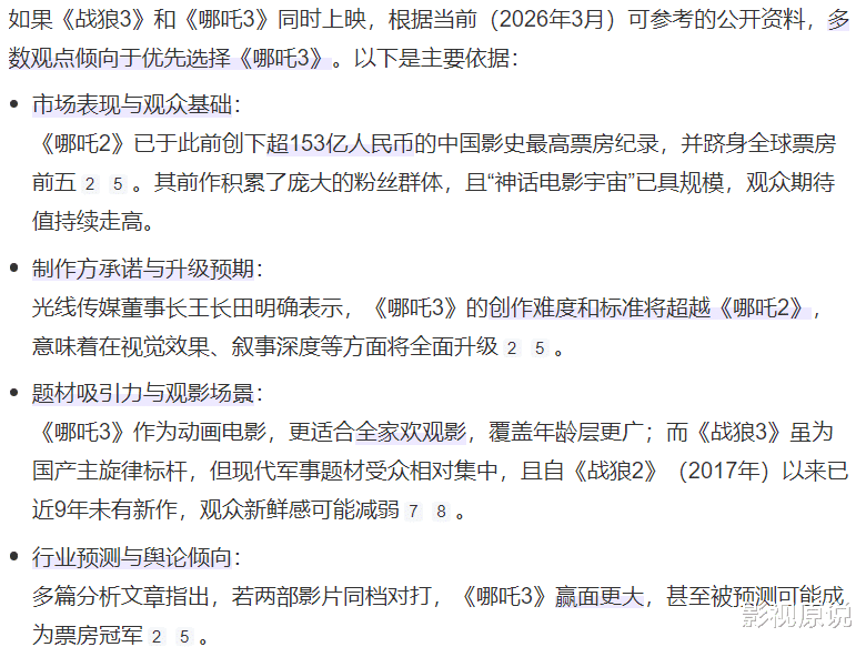 出品人王长田曾说过《哪吒3》的制作难度以及标准都将超越《哪吒2》,而且它的受众群体涵盖了各个年龄段,属于合家欢大片。至于《战狼3》,则主要趋向于硬核动作、爱国主义题材还有军事战争的爱好者。