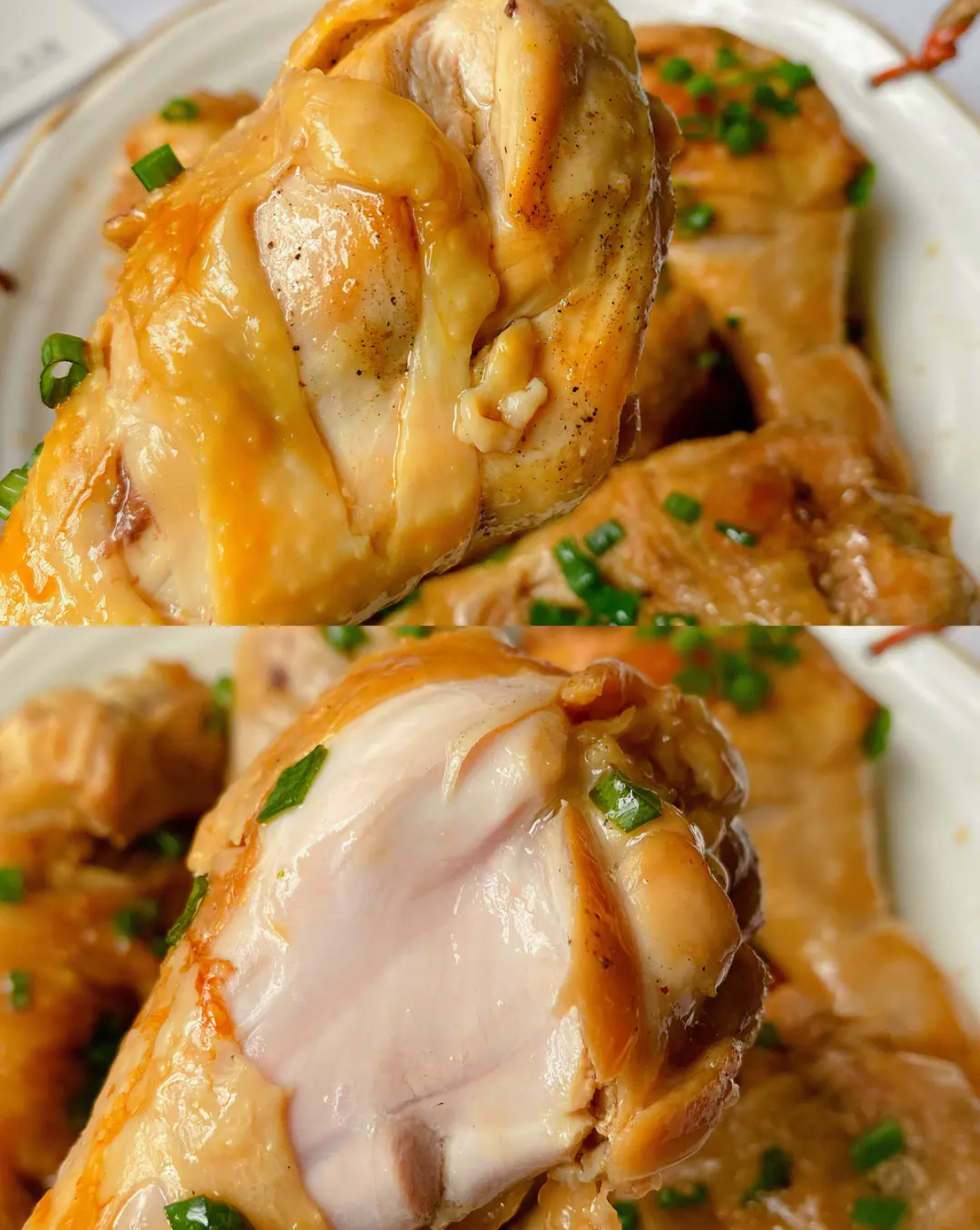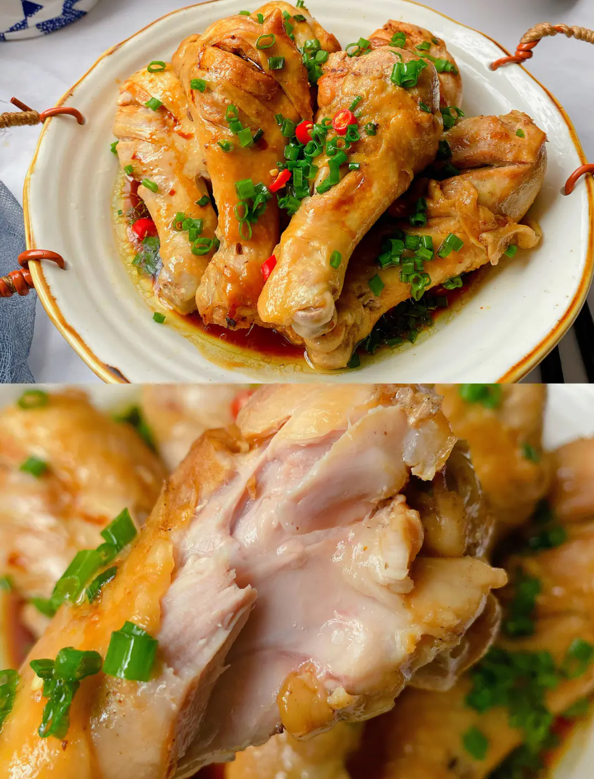 时间到!打开锅盖,那浓郁的香气扑面而来,差点把我自己都香晕了。把鸡腿拿出来,放在盘子里,撒上一些新鲜的葱花和红红的小米辣,就像给鸡肉戴上了一顶漂亮的帽子。然后,再烧一些热油,把热油“滋啦”一声浇在葱花和小米辣上,这一步就像是给这道菜注入了灵魂,香气瞬间被激发出来,弥漫在整个厨房。最后,再淋上一些生抽,一道美味的无水葱油鸡就大功告成啦!