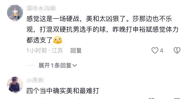 有网友表示,这四位对手中,张本美和确实是最难打的那个,但也相信王曼昱能够抗住压力,成功晋级。