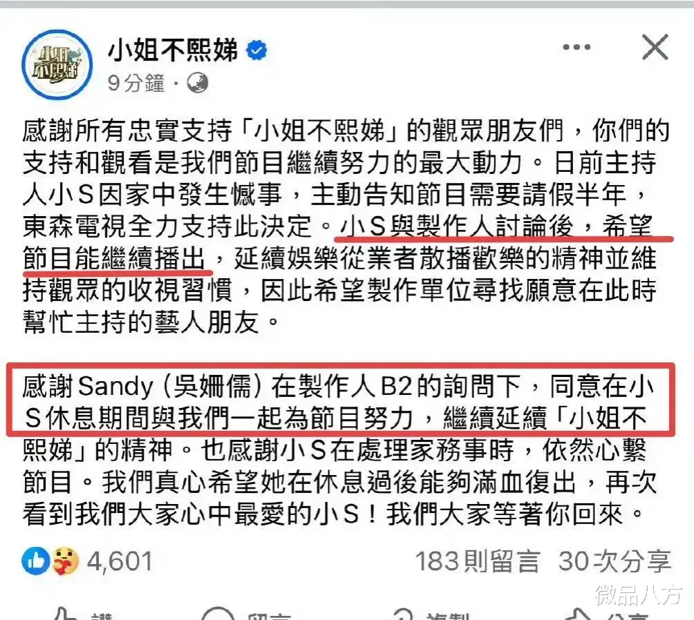 有圈内人士透露,小S这半年将专注陪伴家人,尤其是大S的孩子们。"失去妈妈的孩子最需要亲人的陪伴,小S说要替姐姐好好照顾他们。"这番话让人不禁泪目。对于小S的请假决定,观众纷纷表示理解和支持。"让她好好休息吧,愿时间能抚平伤痛。""等她回来时,一定会带着新的能量重新出发。"娱乐圈里的情谊往往经不起时间考验,唯独姐妹情深最让人动容。大小S用三十多年的相知相守,诠释了血脉相连的真谛。即便此刻天各一方,那份刻骨铭心的感情永远不会改变。半年后,当小S重返荧屏,她或许不再是那个笑声爽朗的主持人。失去至亲的痛苦会让她改变,会让她成长,也会让她带着更深的生命体悟面对观众。