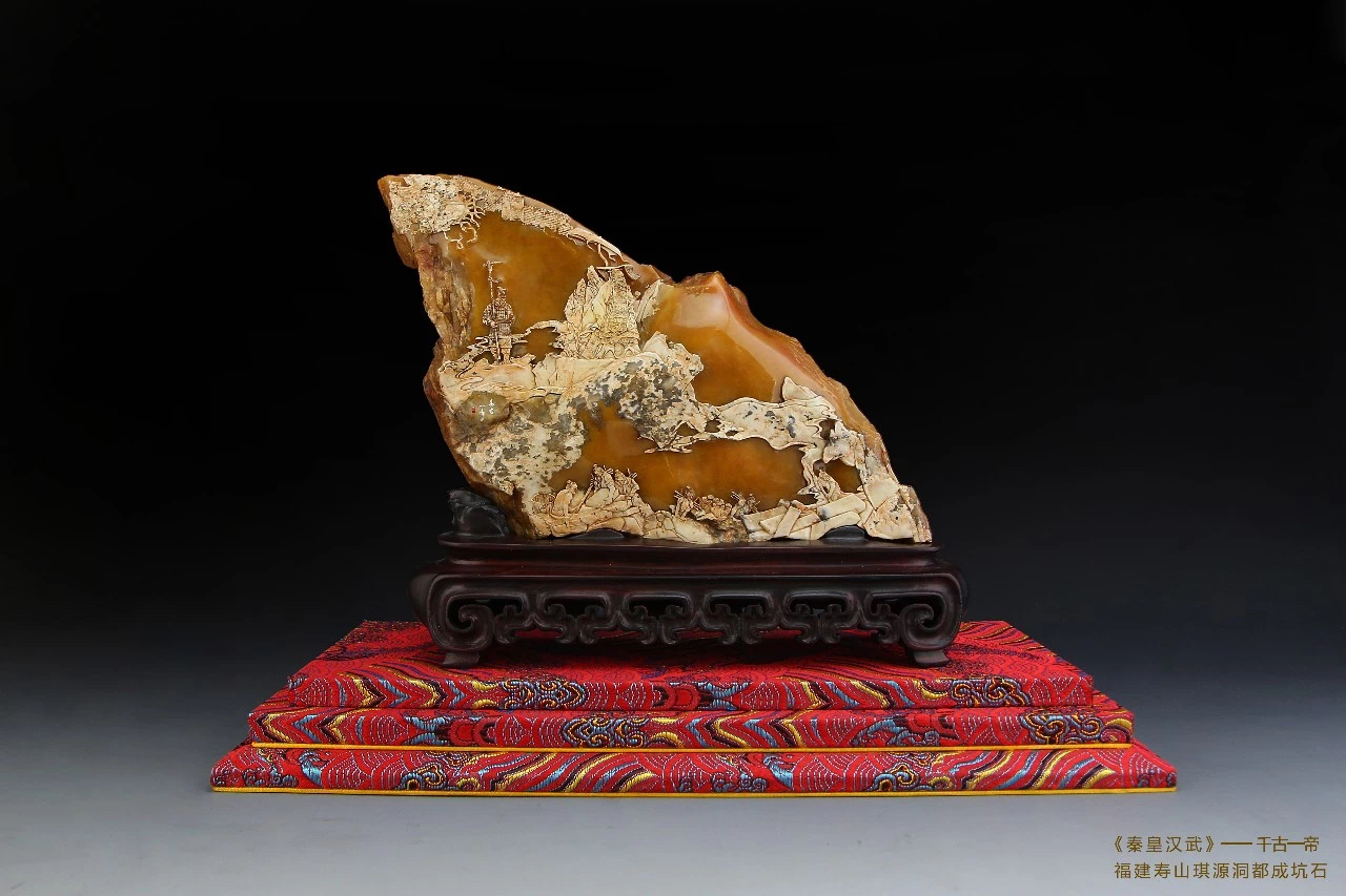 在《秦皇汉武》这件作品中,徐桂鸣巧妙地利用寿山石的天然形态与色彩变化,通过高浮雕技法,塑造了秦始皇与汉武帝两位中国历史上极具代表性的帝王形象。秦始皇部分,他运用刚劲有力的线条和块面处理,展现出统一六国的霸气与威严;汉武帝部分,则通过更为复杂的构图和细腻的刻画,表现其开疆拓土、雄才大略的气度。尤为精妙的是,作品不仅刻画了人物本身,还通过背景中的长城、兵马俑、丝绸之路等元素,构建了一个浓缩的历史场景,使观者能够在方寸之间感受到一个时代的宏大气象。