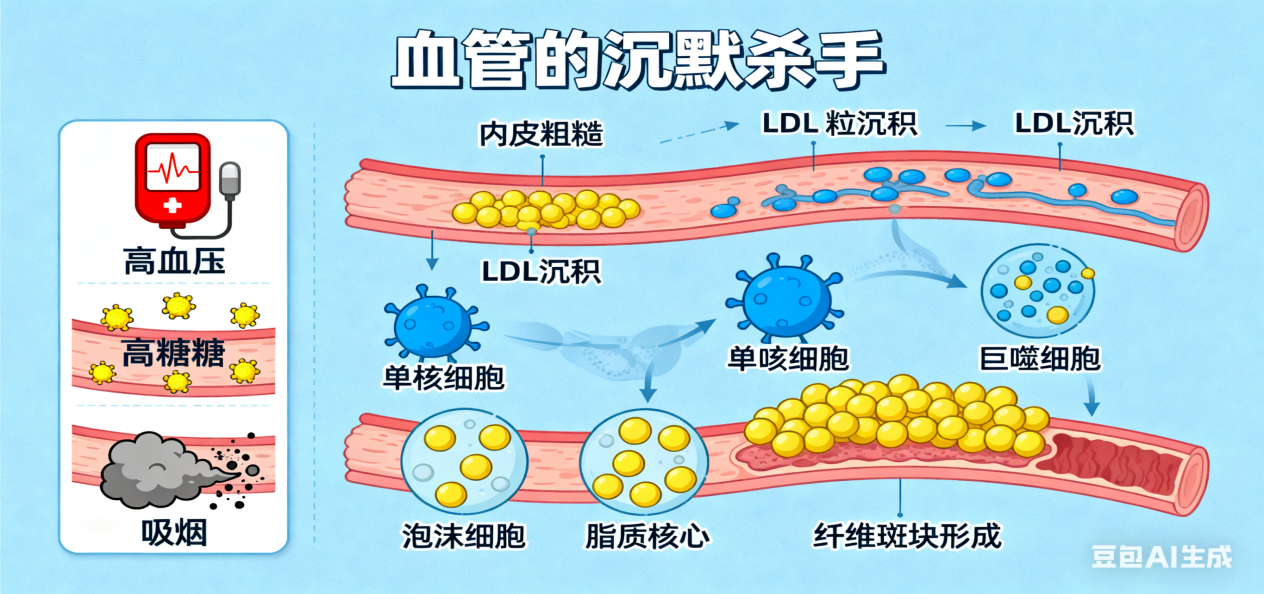内皮损伤:高血压、高血糖、吸烟等因素损伤血管内皮光滑层,使其变得粗糙。