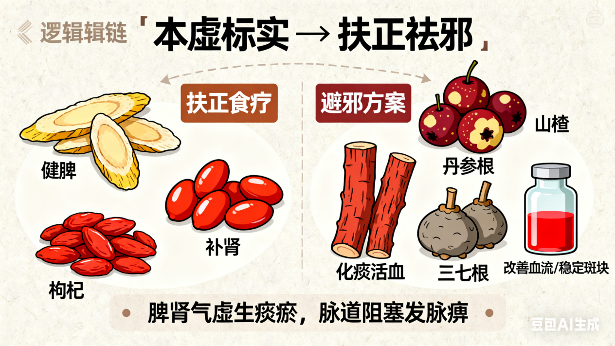 中医将其归为 “脉痹”“痰浊”“血瘀” 范畴,核心病机为 “本虚标实”。本虚以脾肾气虚为主,脾虚生痰浊(对应脂质沉积),肾虚致血瘀(对应血流缓慢);标实为痰瘀互结阻塞脉道,日久化热生毒加剧炎症。