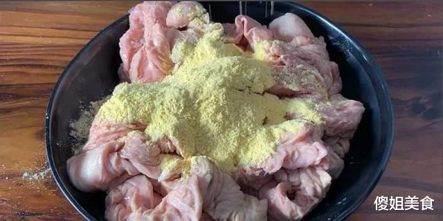 先把猪大肠用清水冲一下,然后把玉米面撒上去,里里外外都要撒到。接下来就像搓衣服那样搓揉,你会发现玉米面一下子就把大肠表面的黏液和脏东西都粘下来了。