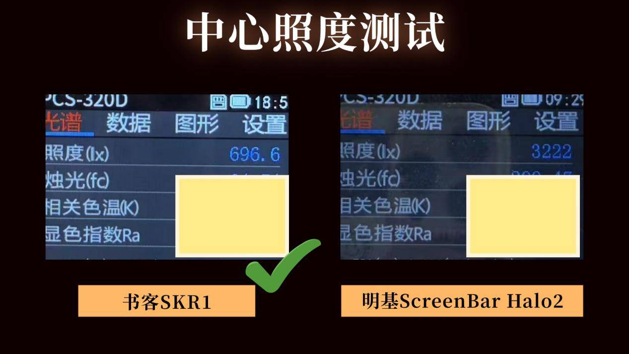 明基显示器挂灯为什么贵?中心照度的数值和桌面的照明情况息息相关,书客SKR1的照明数值属于比较适中,一般使用的桌面大小基本都可以使用,书客在这方面采用了全新一代AOT光路菱镜结构搭配17.5°专研黄金光面角度,实现了对光线的精确控制。每一道光束都被均匀投射至工作区域,避免了传统灯具常见的局部过亮或暗区问题,使照明更柔和、舒适,经测试可有效降低约28%的视觉疲劳感。而明基ScreenBar Halo2的照度数值相对来说比较高,虽然照明范围会广泛很多,比较适合大桌子使用,但容易形成眩光,影响视觉体验。