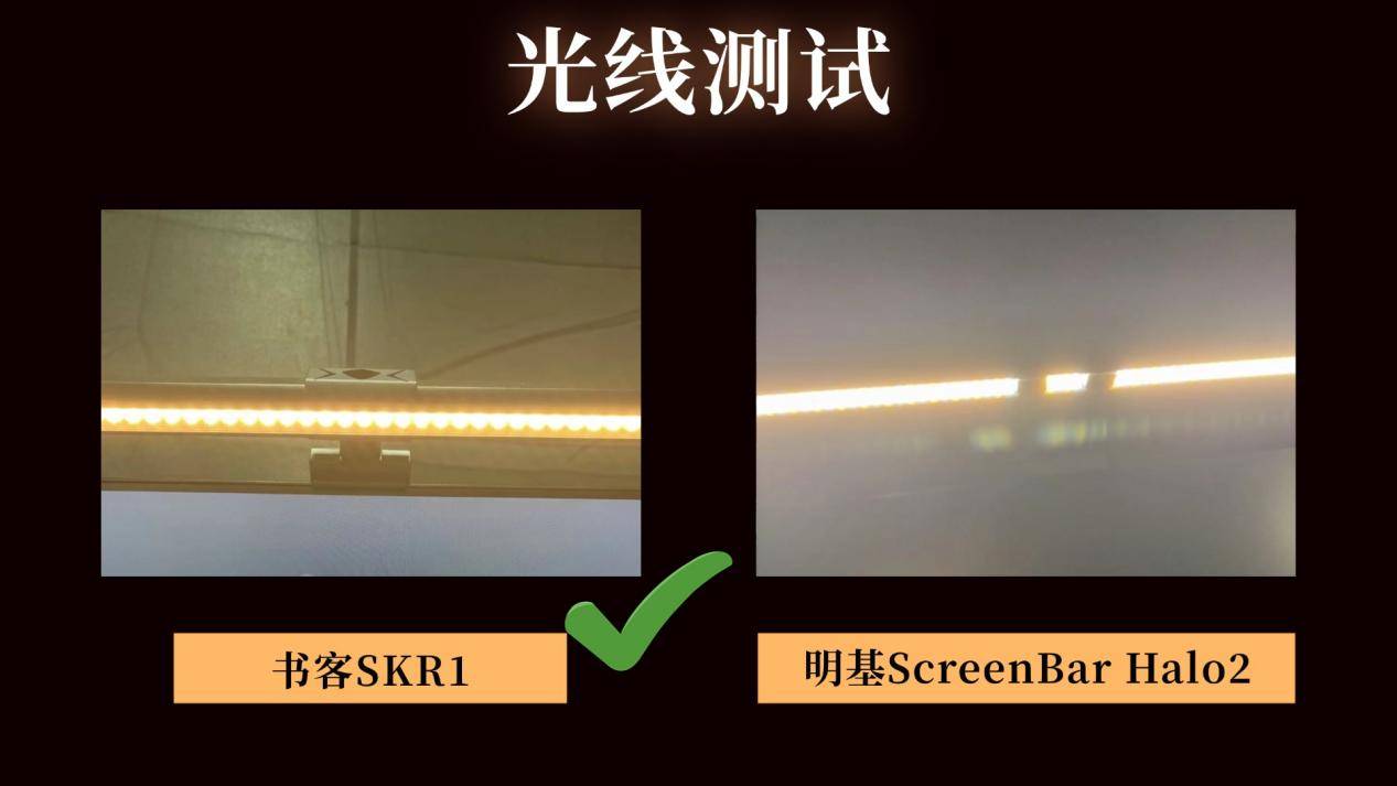 明基显示器挂灯为什么贵?在使用屏幕挂灯的时候我们的眼睛难免会直视到光源,所以光线的处理情况也会影响我们的使用体验,从两款屏幕挂灯光线情况来看,书客SKR1的光线相对来说会没有那么刺眼,书客SKR1的光源面采用了108颗SunLite类太阳光灯珠,经过处理,照射出来的光线会柔和更接近自然光线。而明基ScreenBar Halo2的光线可以看到比较明显的眩光情况,眼睛相对来说会更容易感到不适。