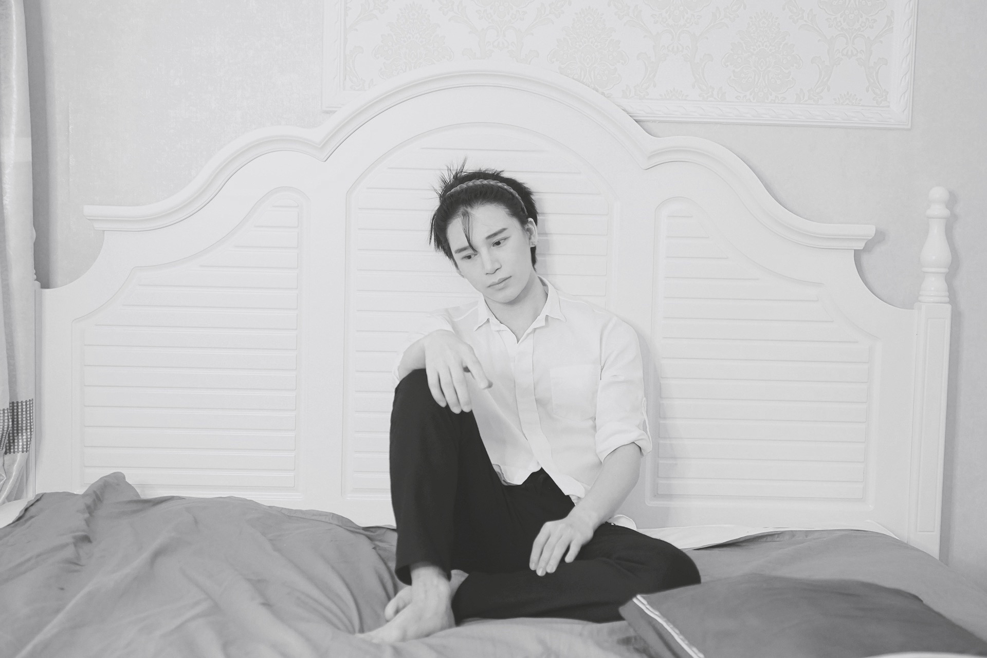 当镜头褪去浮华色彩,陈奕天的面容在黑白光影中显露出雕塑般的质感。这组颠覆常规的写真,犹如宣纸上晕开的墨韵,以最纯粹的明暗对比勾勒出艺术家骨子里的高贵气质。背头造型将他的面部轮廓化作一道流畅的山脊线,而那缕垂落的发丝恰似名家挥毫时故意留白的飞白笔触,在严谨中平添三分不羁的侠气。