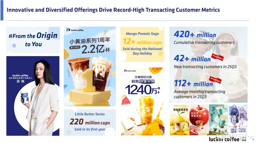 郭谨一表示,“今年第三季度,我们首次达成月均交易客户数破亿的重要里程碑。”财报显示,瑞幸第三季度新增交易客户超4200万,月均交易客户数同比增长40.6%达1.12亿,以上两个指标均创历史新高;截至三季度末,瑞幸累计交易客户数突破4.2亿。