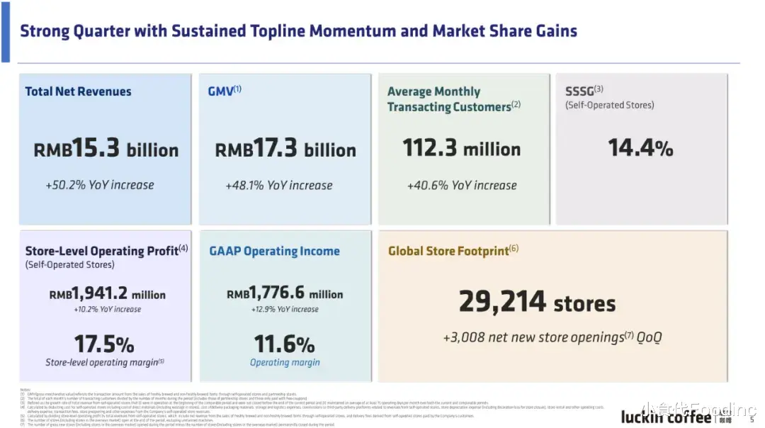 根据这家在国内拥有最多门店的咖啡连锁公布2025年第三季度财报,期内,其实现总净收入为152.871亿(人民币,下同),同比增长50.2%;GAAP营业利润为17.77亿元,同比增长12.9%;自营门店同店销售额增长14.4%,较2024年同期下降13.1%的情况显著改善;净新开门店数为3008家,门店总数达29214家。