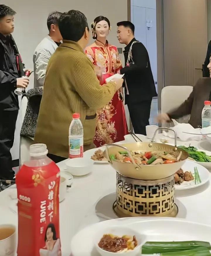 在订婚宴上,陈亚男与郭新鹏穿着中式礼服,两人与亲友们热聊。