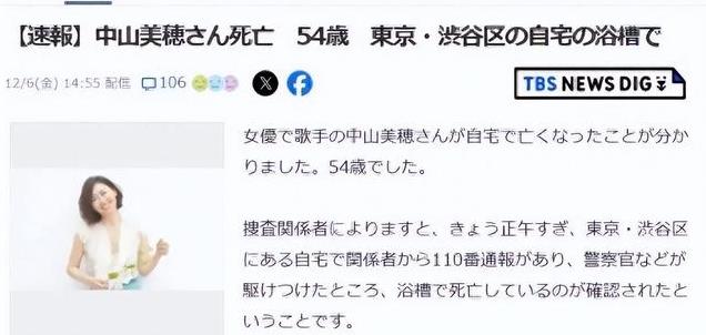 12 月 6 日,日本女演员、歌手中山美穗被发现已在自己家中去世,终年 54 岁。