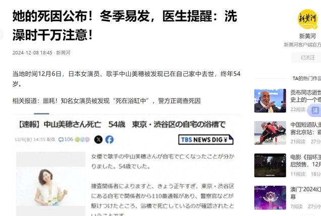 新黄河在 2024-12-08关于《她的死因公布!冬季易发,医生提醒:洗澡时千万注意!》的报道