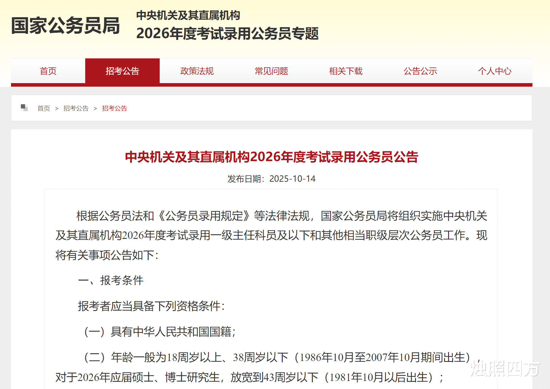 10月14日,国家公务员局发布中央机关及其直属机构2026年度考试录用公务员公告,2026国考时间正式启动。报考年龄的较之以往放宽3岁,成为本次国考招录的一大亮点。其中,报考者年龄一般为18周岁以上、38周岁以下(1986年10月至2007年10月期间出生),对于2026年应届硕士、博士研究生,放宽到43周岁以下(1981年10月以后出生)。