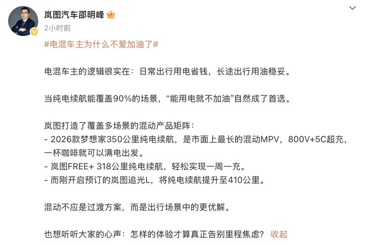 电混车主为什么不爱加油了?10月3日,岚图汽车CBO邵明峰在其社交媒体发文表示,电混车主的用车逻辑很实在,日常出行用电省钱,长途出行用油无焦虑,这种“日常省、长途稳”的组合,才是新的出行标准。