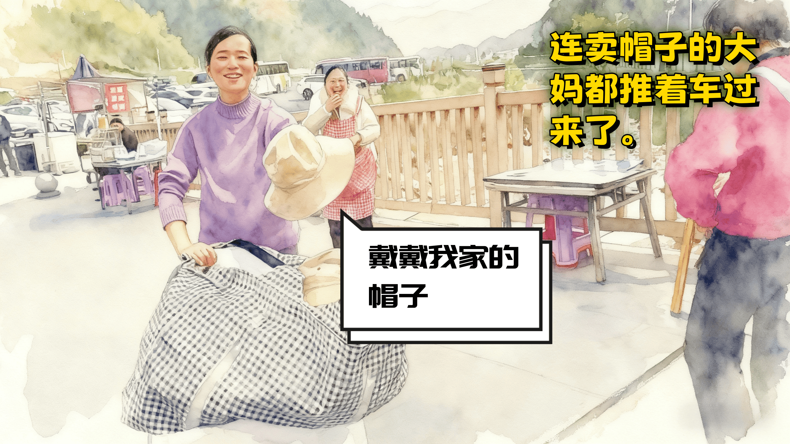 最后总算是完成了挑战。下山又碰到那些小贩大妈,看到卖帽子的又来了,博主彻底绷不住了。