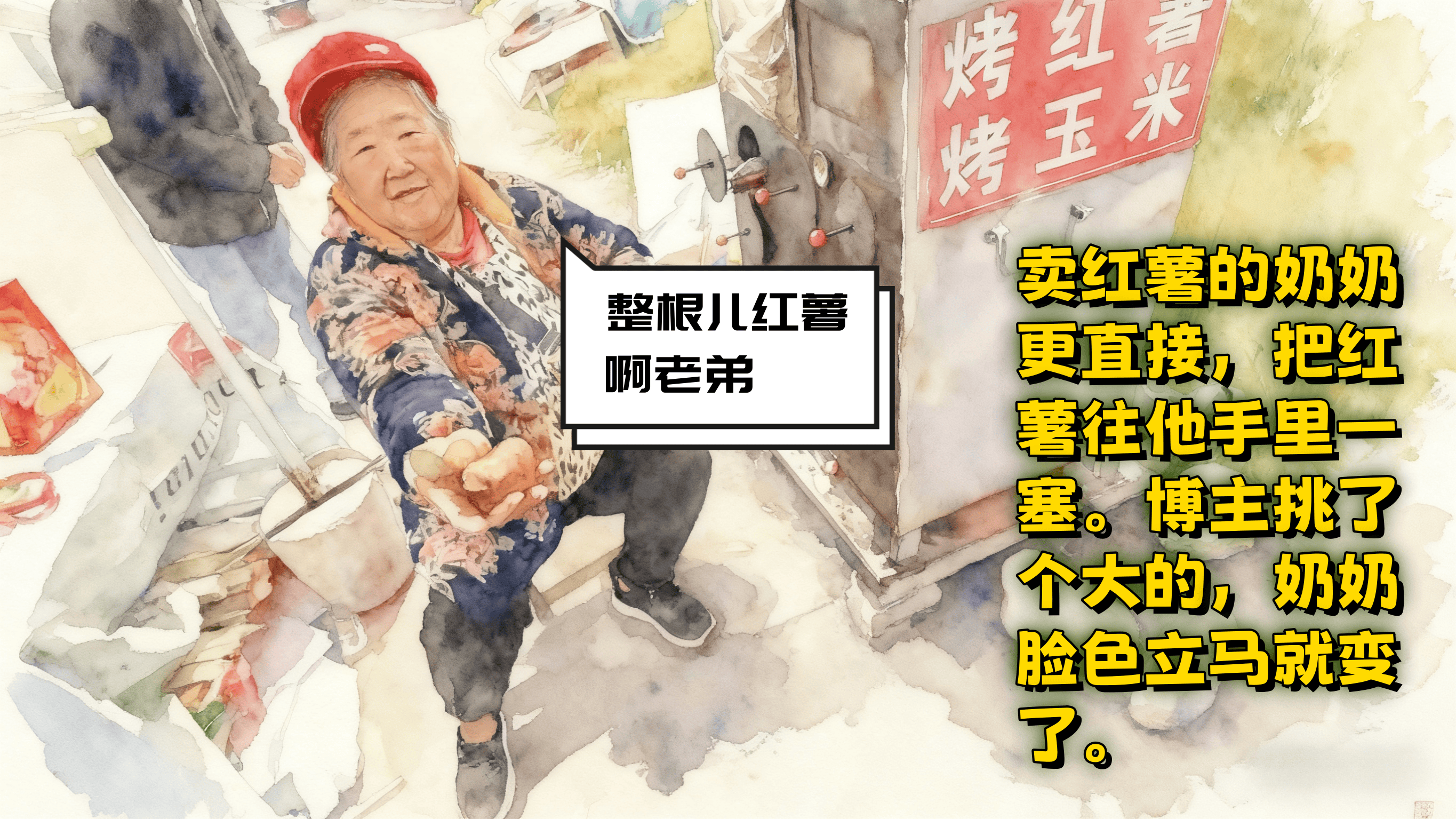 卖红薯的奶奶更直接,把红薯往他手里一塞。博主挑了个大的,奶奶脸色立马就变了。