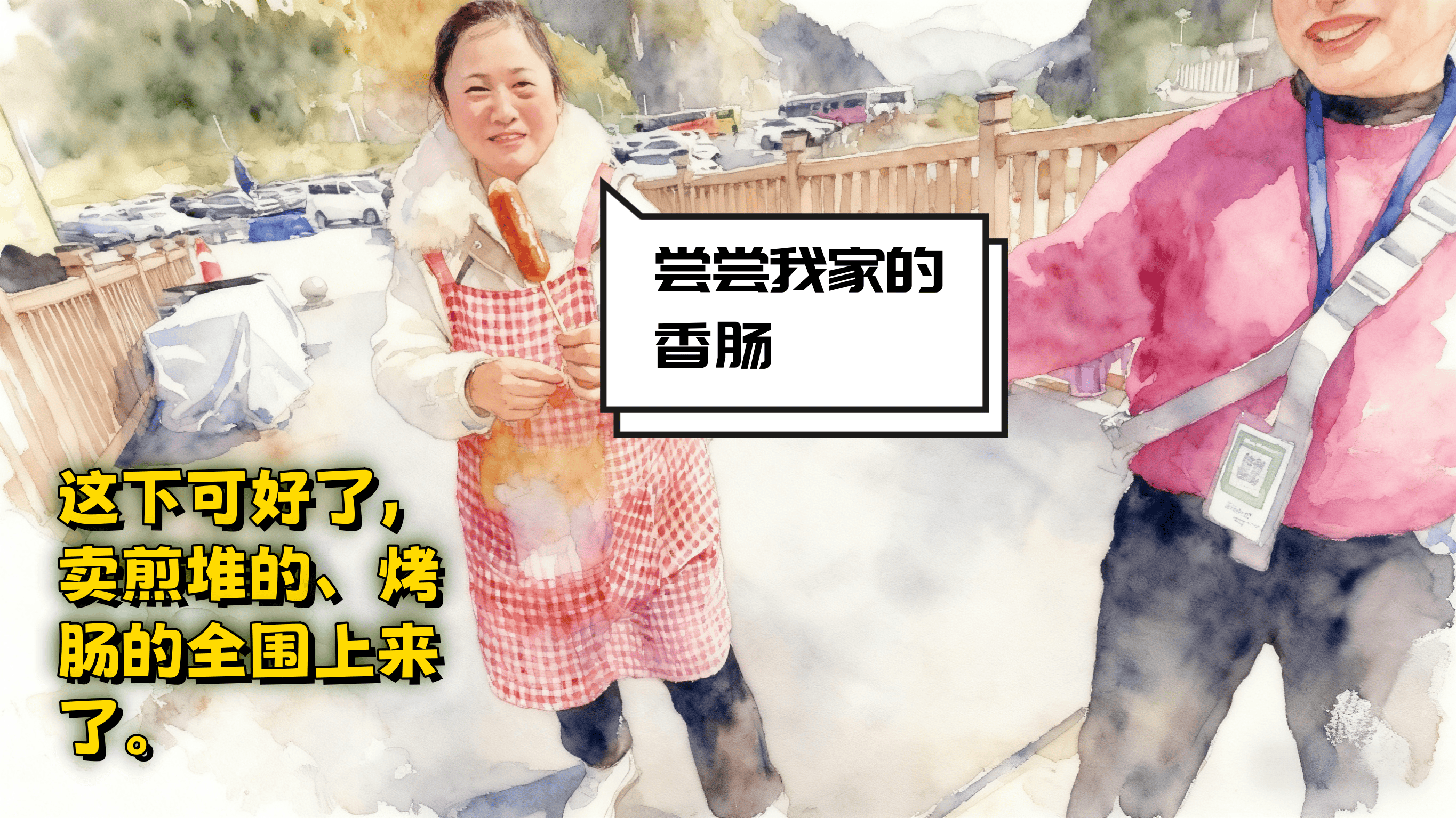 这下可好了,卖煎堆的、烤肠的全围上来了。