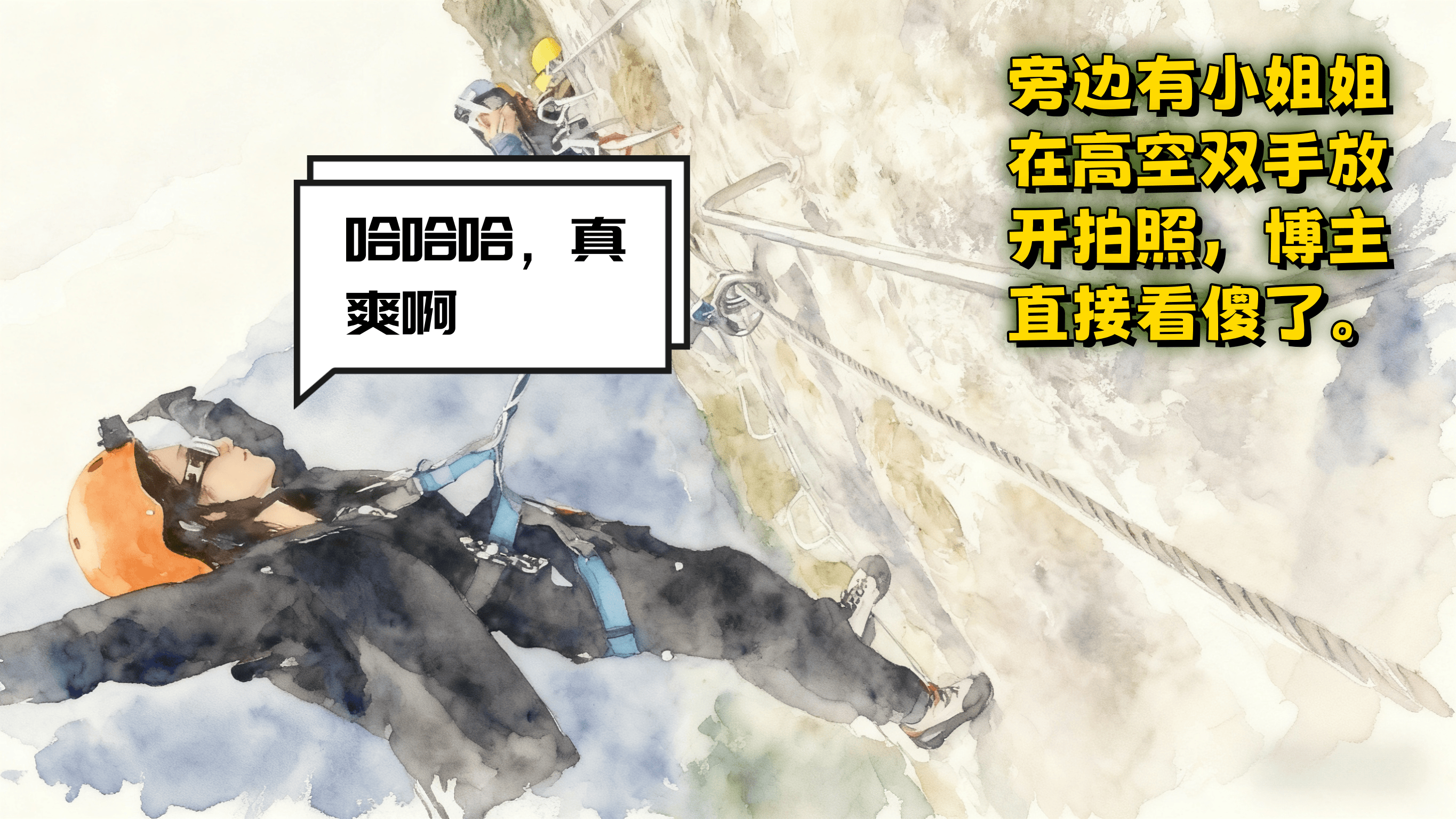 博主灌了瓶红牛就上了,走在悬崖边的钢梯上,吱哇乱叫。