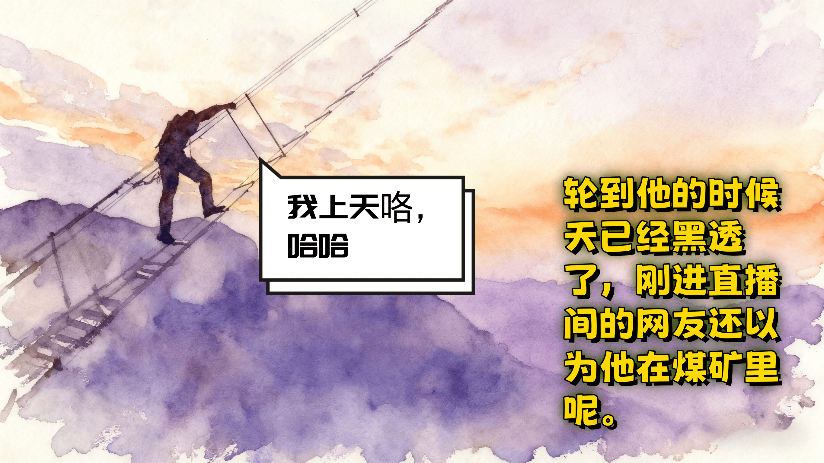 轮到他的时候天已经黑透了,刚进直播间的网友还以为他在煤矿里呢。