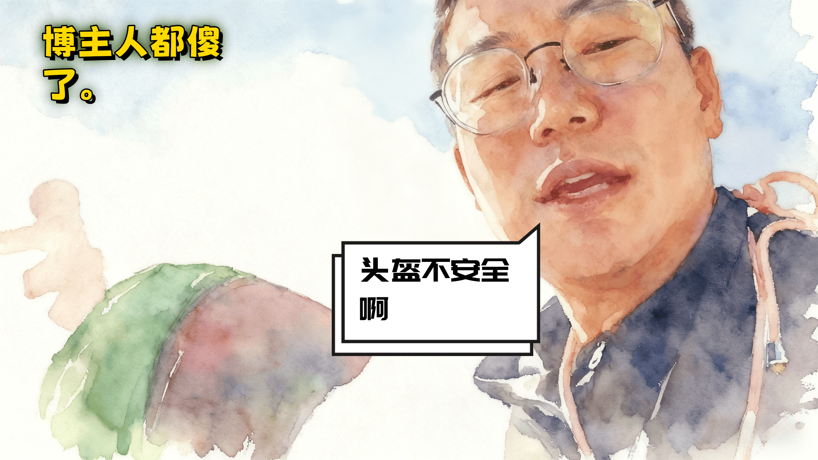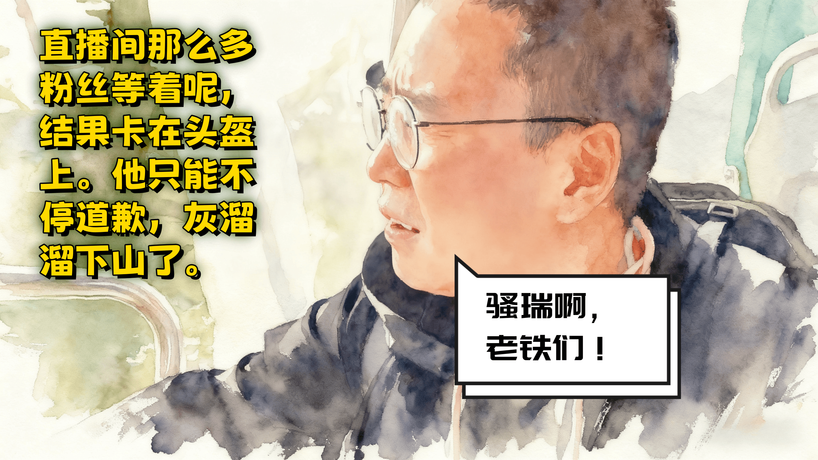直播间那么多粉丝等着呢,结果卡在头盔上。他只能不停道歉,灰溜溜下山了。