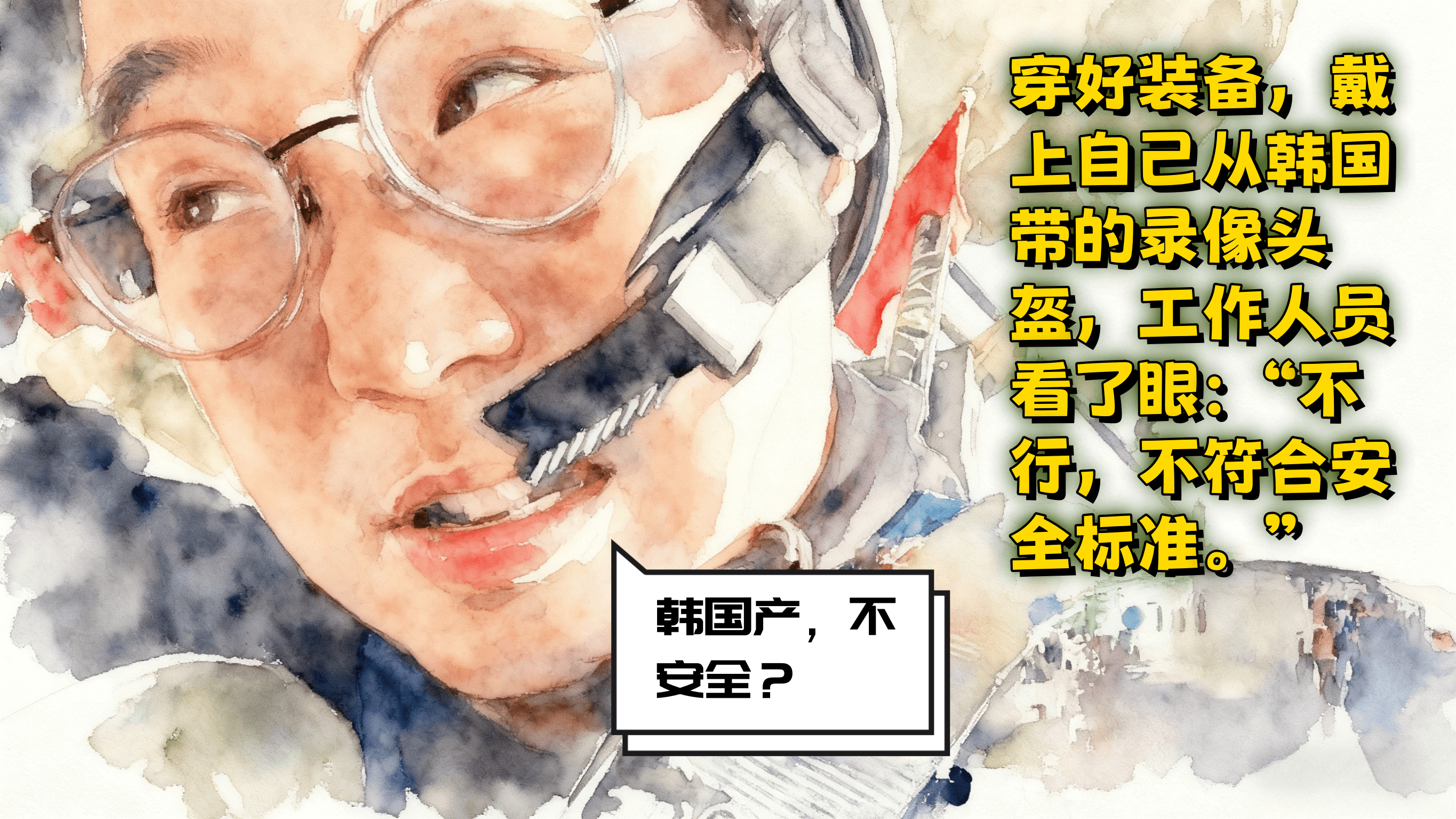 穿好装备,戴上自己从韩国带的录像头盔,工作人员看了眼:“不行,不符合安全标准。”
