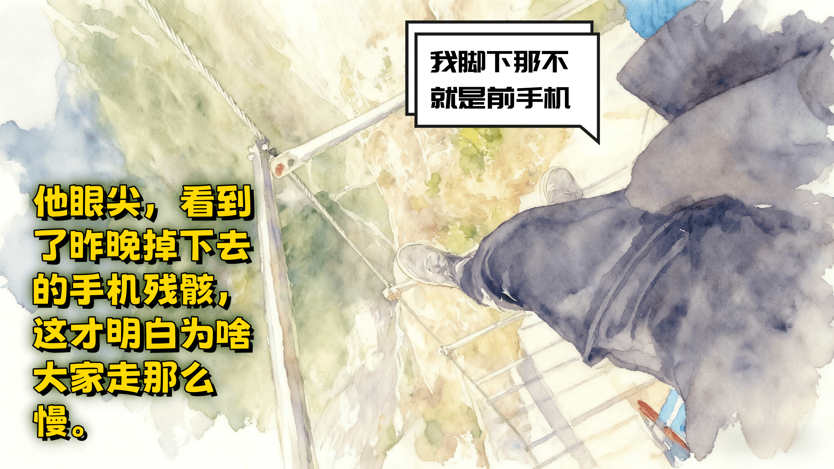 他眼尖,看到了昨晚掉下去的手机残骸,这才明白为啥大家走那么慢。