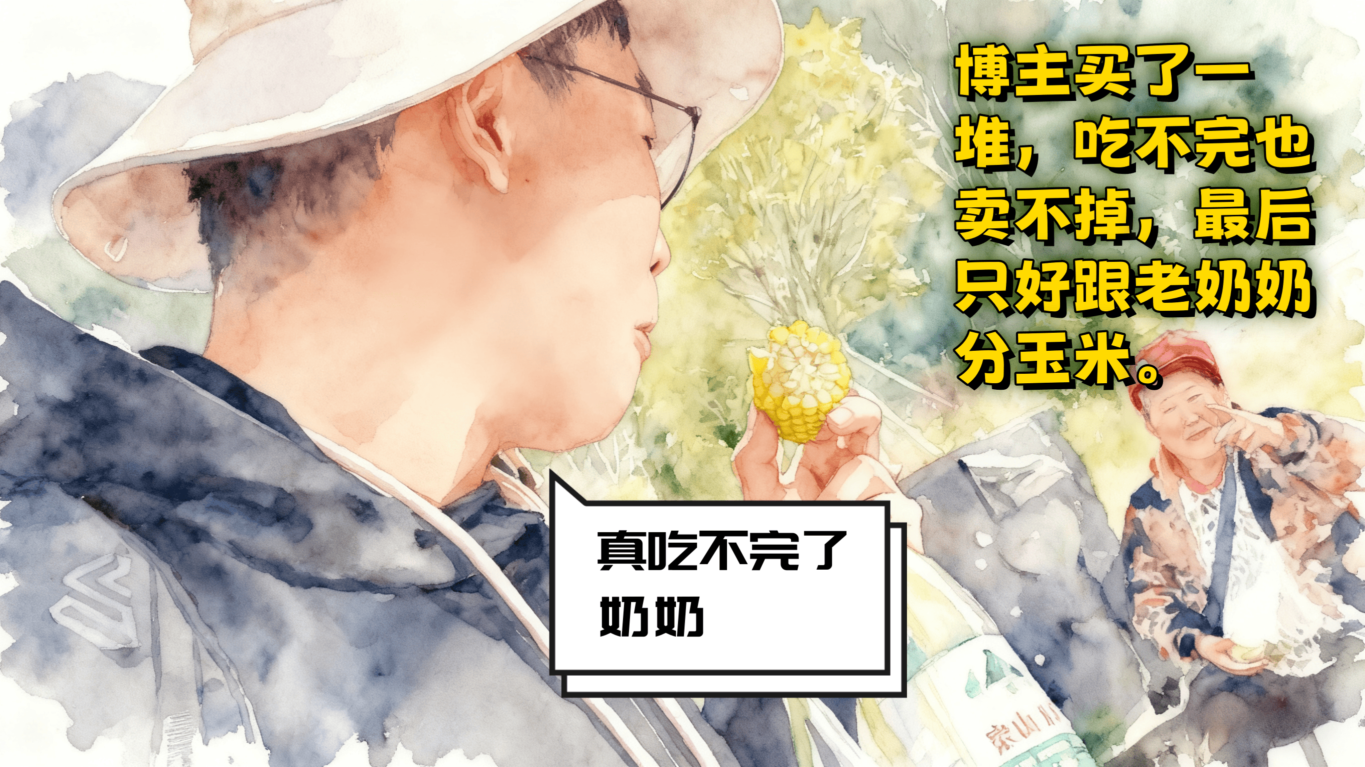 博主买了一堆,吃不完也卖不掉,最后只好跟老奶奶分玉米。