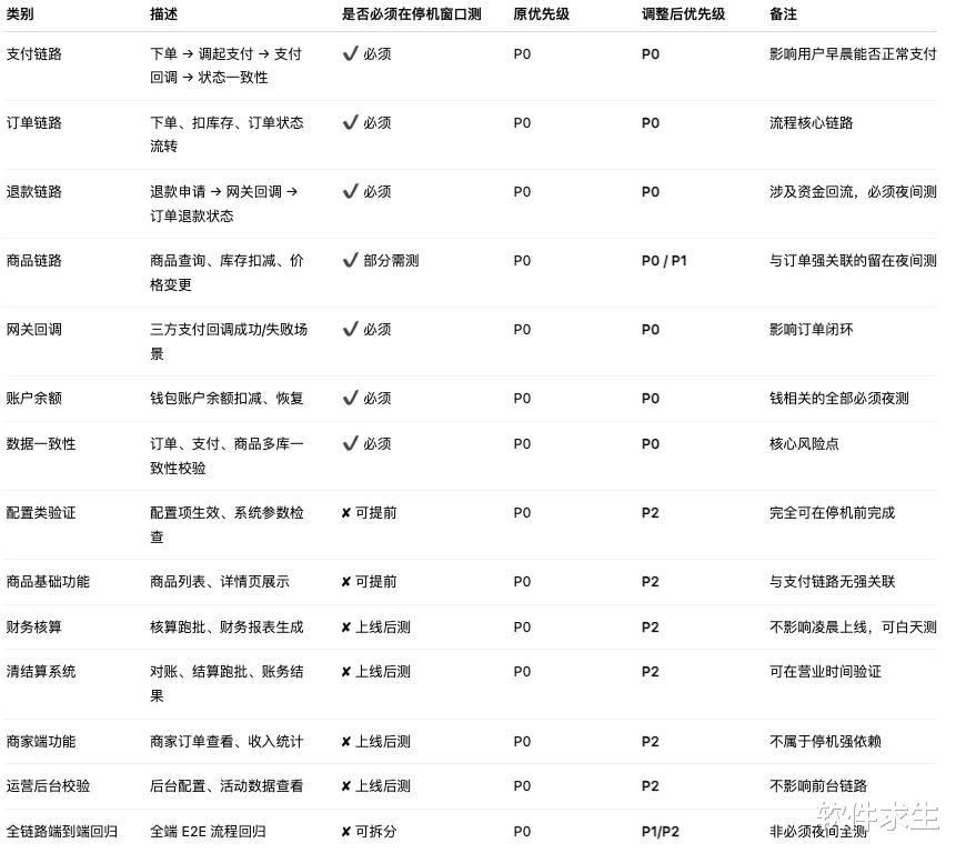 “全链路 7 个端口 + 各类订单 + 各类商品 + 对账 + 财务 + 清结算……如果全部按 P0 执行,至少要两天两夜。”