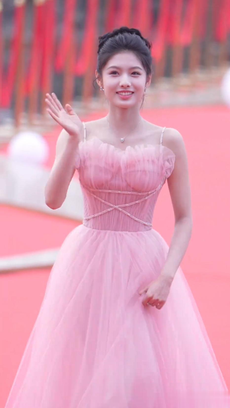 红毯上,一袭粉丝纱质的蓬蓬裙,头发高高盘起,美像个小公主一样。