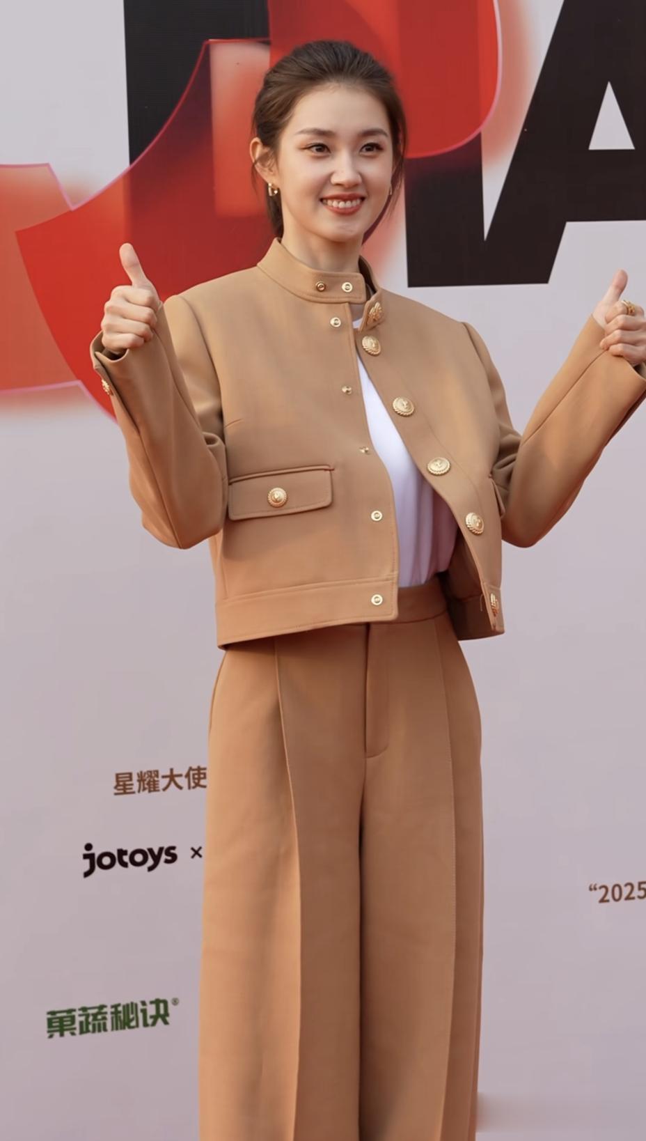“排骨精”们都穿着展露身材的华丽礼服,唯有她是“全副武装”,一件简约的白T,配上一套咖色的套装,头发随意归拢扎成马尾,看上去清爽又干练。