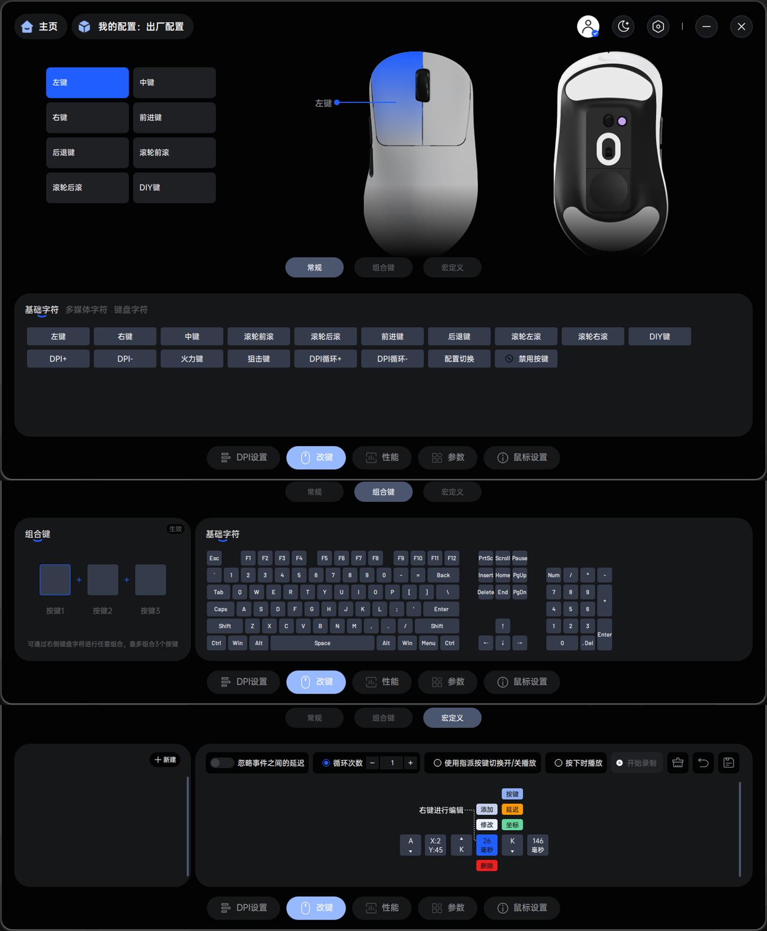 鼠标还自带A Hub驱动程序,支持Windows和macOS双系统,客户端版和网页版,可以直接在驱动里对当前鼠标的回报率、DPI、按键功能、传感器角度、32档按键消抖等全面自定义等。还可以设置配置文件跟随切换,适应不同的使用场景。同时新增了多种性能模式可选, 如办公模式:节能优先。狂暴竞技模式专为游戏而生等。