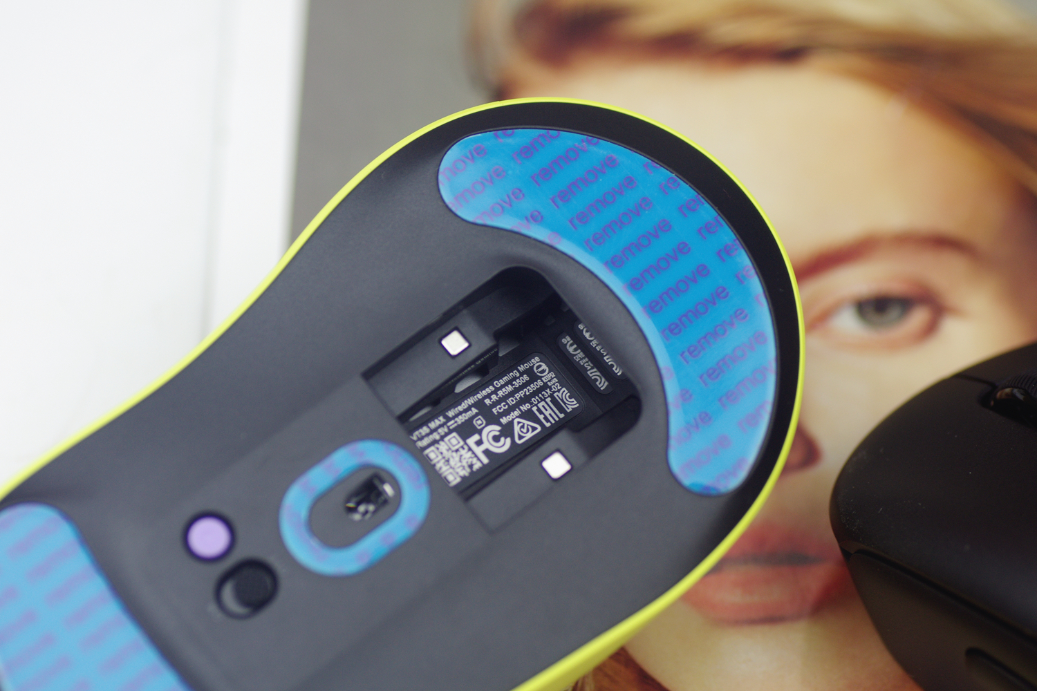 鼠标底部是大面积脚贴、开关键、DIY按键、磁吸式接收器收纳仓、以及家族化的可更换底盖,能够替换成无线/触点模块,拓展多种充电方式。