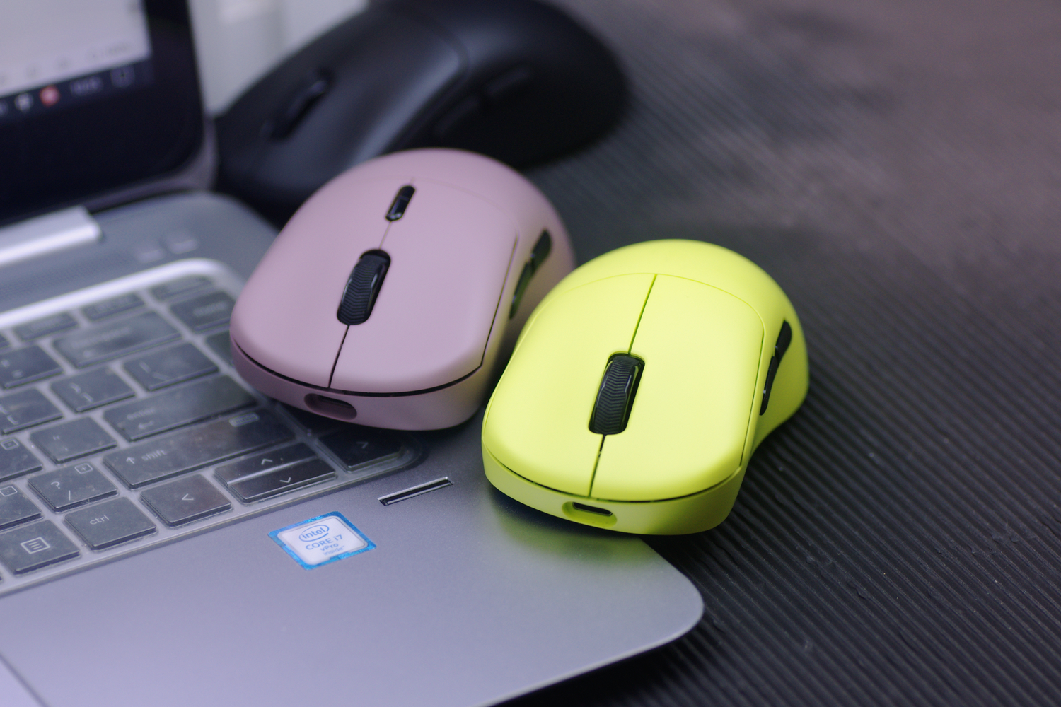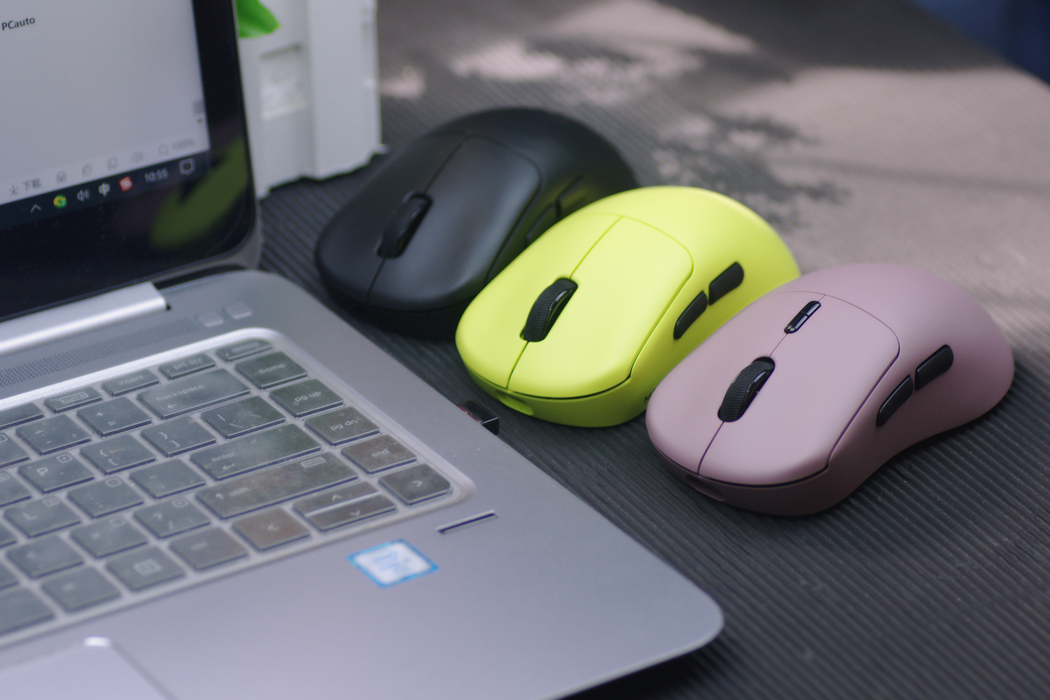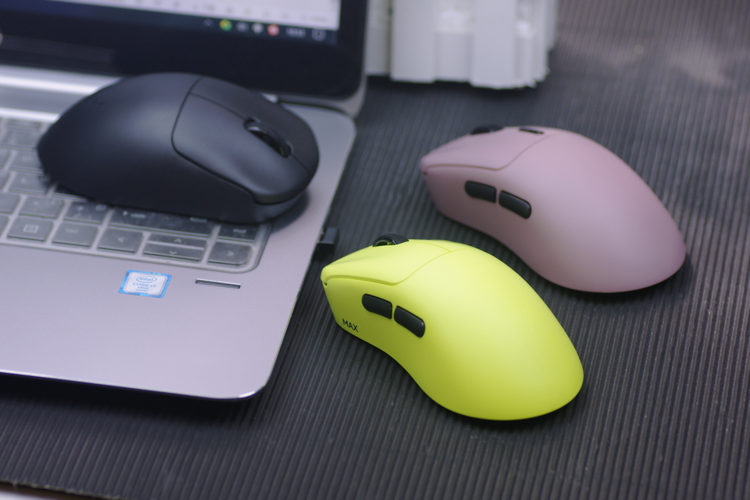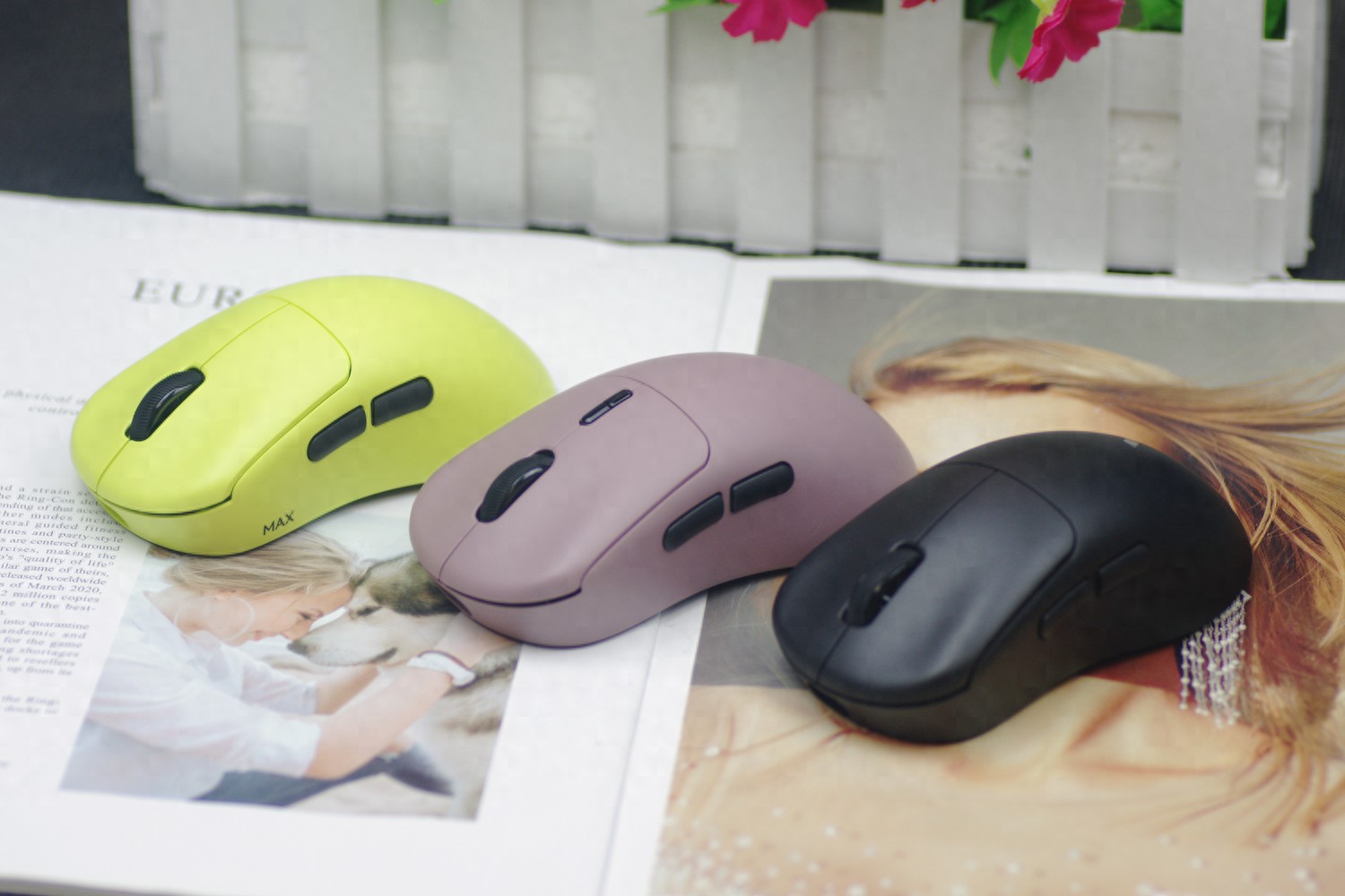 黄色的是VT3s max,左键下方印有暗金色max字样;冰梅粉是VT3,滚轮后面有DPI按键,比另外两个型号大一点,长半厘米左右,更适合大手玩家;黑色是VT3s,和VT3s MAX一样都是适合中小手的鼠标,但比VT3系列少了DPI键,从外观上来看区别不是很大。