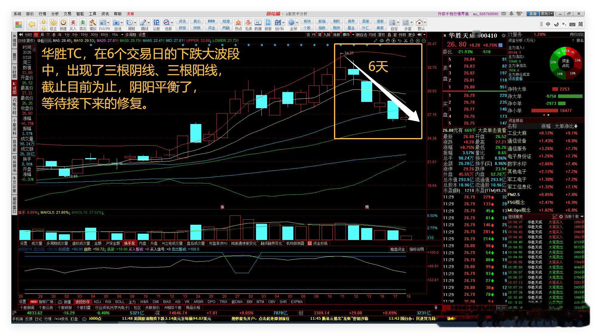华胜TC,在6个交易日的下跌大波段中,出现了三根阴线、三根阳线,截止目前为止,阴阳平衡了,等待接下来的修复。如下图所示: