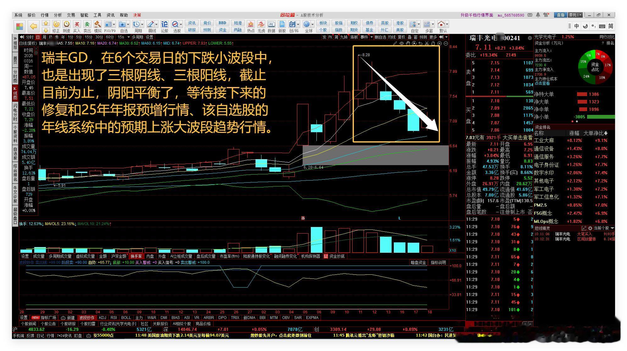 瑞丰GD,在6个交易日的下跌小波段中,也是出现了三根阴线、三根阳线,截止目前为止,阴阳平衡了,等待接下来的修复和25年年报预增行情、该自选股的年线系统中的预期上涨大波段趋势行情。如下图所示: